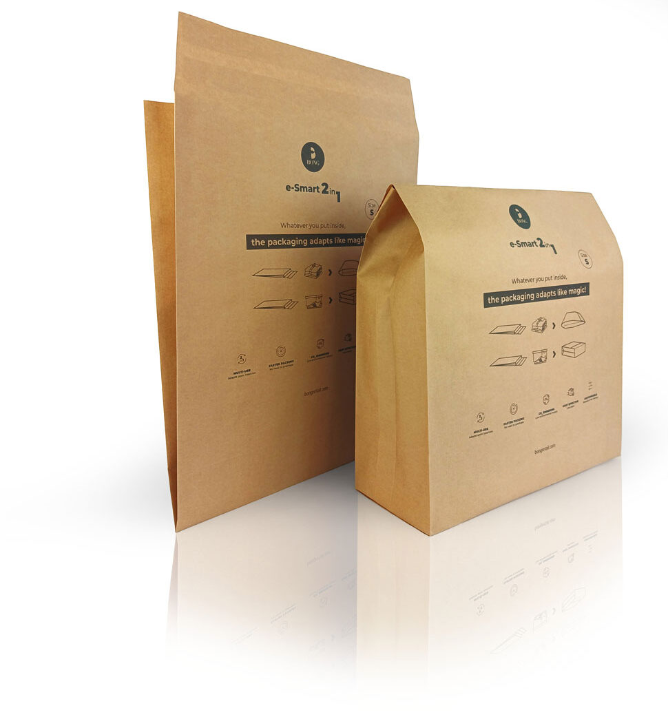 - Gain de temps : expédiez vos objets volumineux plus rapidement ! Avec e-Smart 2in1, plus besoin de pré-former manuellement votre pochette à fond carré (bock bottom) pour insérer votre boite en carton. Un geste en moins dans le processus d’emballage pour vous faire gagner un temps précieux !